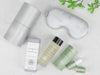 Wellness products including a De-stress Aromatherapy Balm, eye mask, and Sleep Well body oil on a white background.